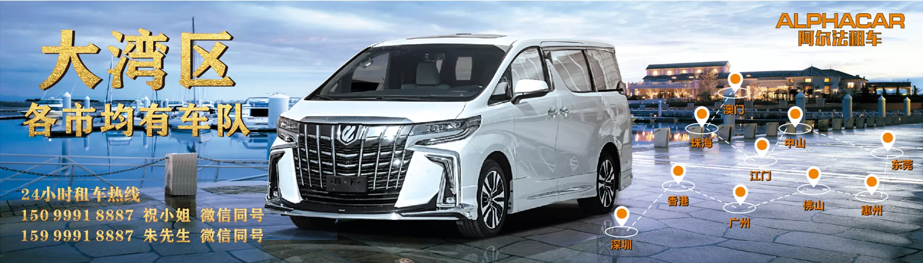 阿尔法租车公司自有车辆新款30系丰田埃尔法、粤港澳双牌埃尔法新款、雷克萨斯LM300、奔驰高端商务车、别克商务系列车辆为您在接待客户提供尊贵高品质的接待服务。与此同时,阿尔法租车提供商务自驾,配驾,接送机服务,司机拥有20年以上的配驾车龄,服务周到。公司顶级商务车均配干湿纸巾,wifi无线网络,充电线,雨伞,矿泉水,毛毯,为您提供最好的乘车服务。